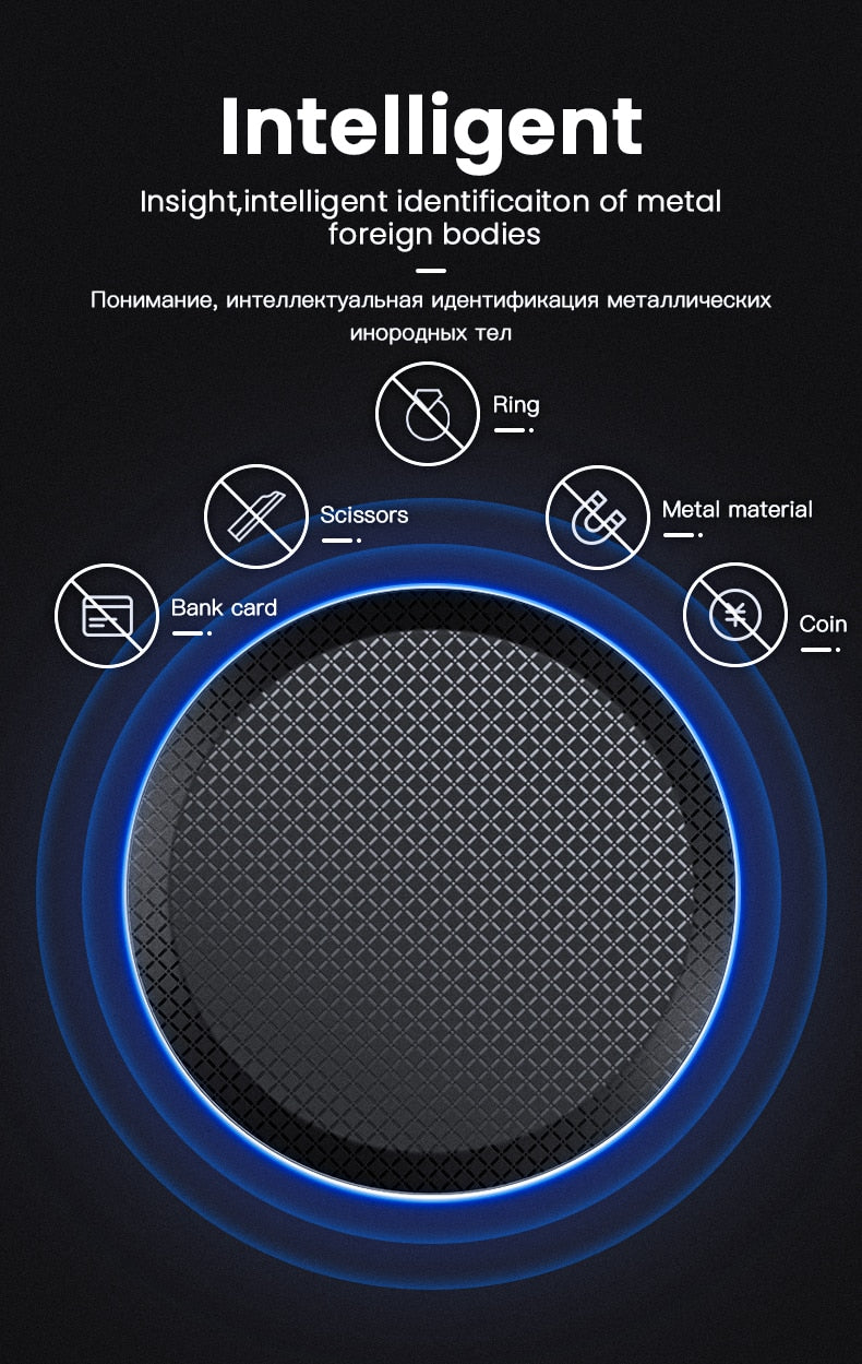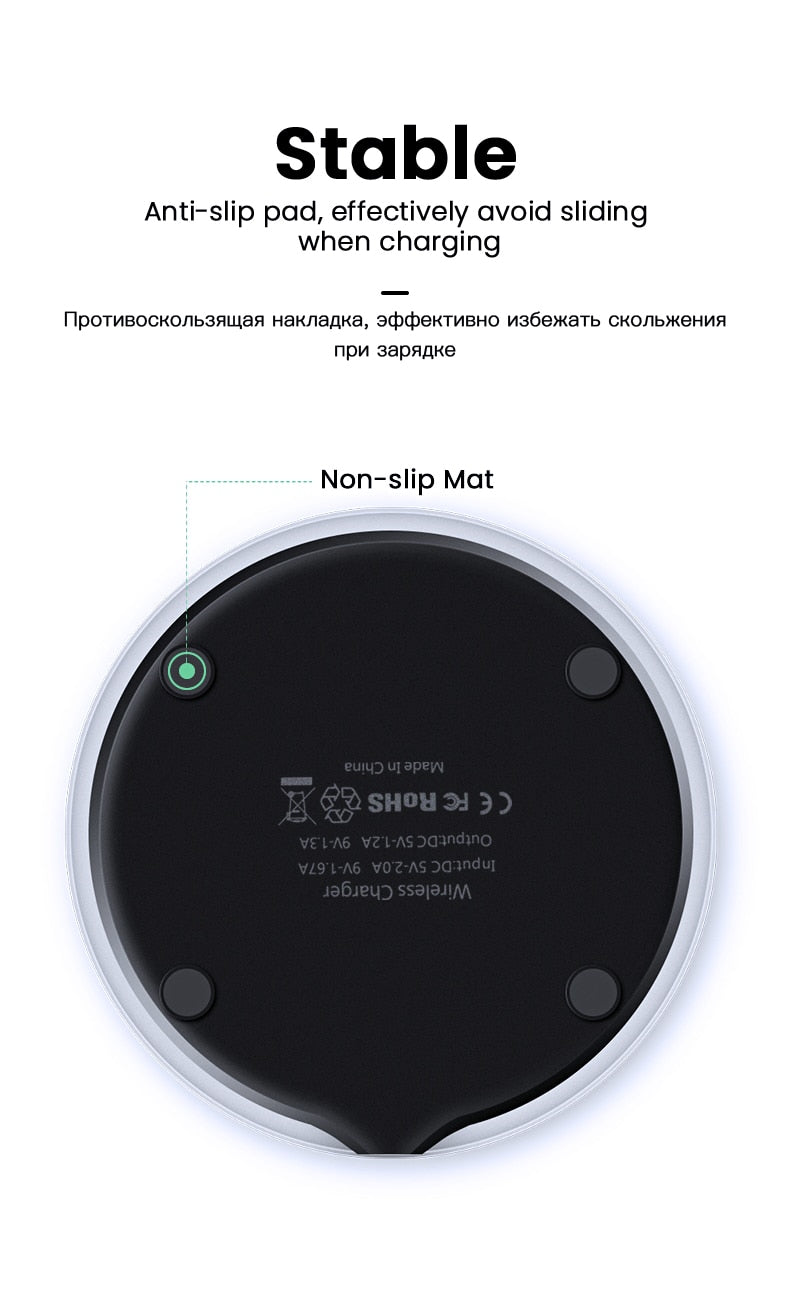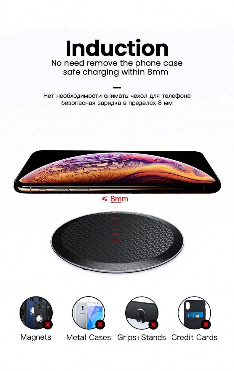 Wireless Charging Pad Specification: Material:Aluminium Alloy & Plastic Interface: iP Interface Attached product: 0.5m Micro USB Cable Size: about 9.7*9.7*0.7cm Input: 5V / 2A 9V / 1.67A Output: 5V / 1.2A 9V / 1.3A charging distance: <=8mm Charging efficiency: >=90% Executive Standard: Qi wireless charging standard Suitable for:Mobile phones with wireless charging function QI Wireless Charger Receiver Module Compatible with: