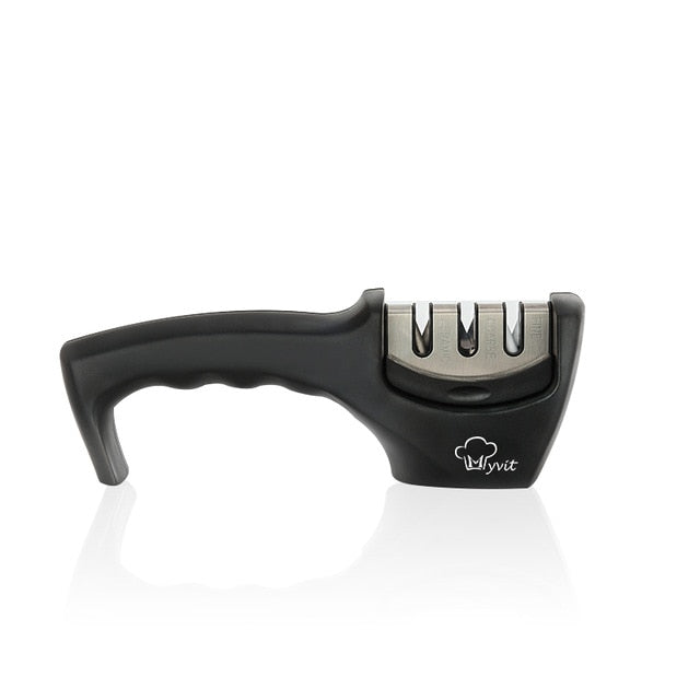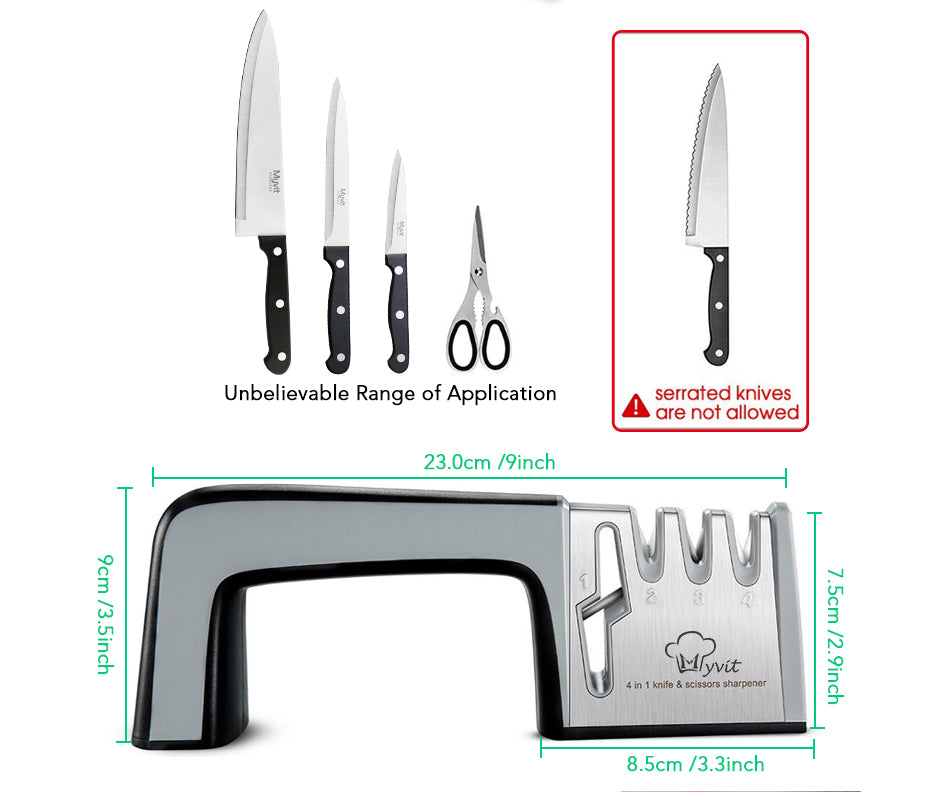 This knife sharpener works great on all types of knives. Keep your knives sharp and ready to use. It is very easy to use, and very sturdy and durable.